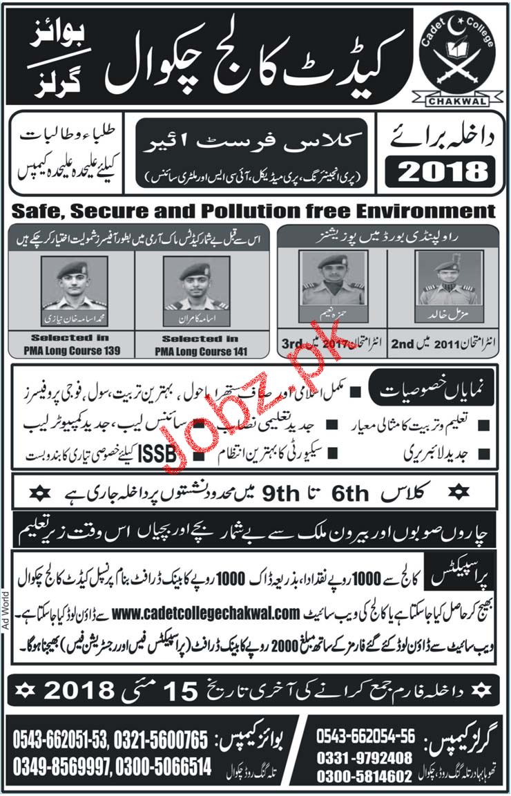 Cadet College Chakwal For Boys & Girls Admission in Class XI in Chakwal. Admission Session 2018-2018. Seprate classes for Boys and Girls. Limited seats from Class VI to Class IX. Read newspaper ad for exact details.