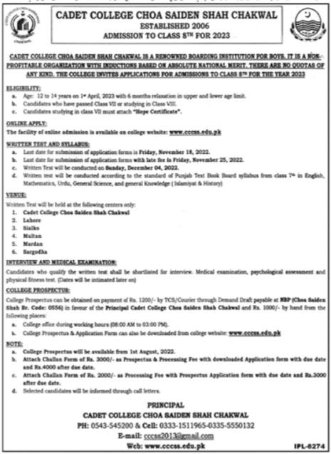 Cadet College Choa Saiden Shah Chakwal Class 8th Admission 2022 23