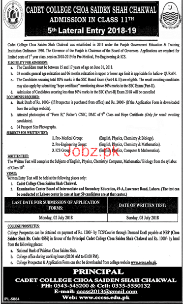 Cadet College Choa Saiden Shaha Chakwal Admission in Class Xi Pre Medical, Pre Engineering and Computer Sciences in Choa Saiden Shah Chakwal. Admission Session 2018-2019. Read newspaper ad for exact details.