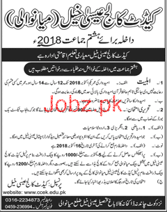 Cadet College Essa Khail Mianwali Admission in Class VIII in Mianwali. Admission open for academic session 2019.candidate age should be 12 to 14 years. Read newspaper ad for exact details.