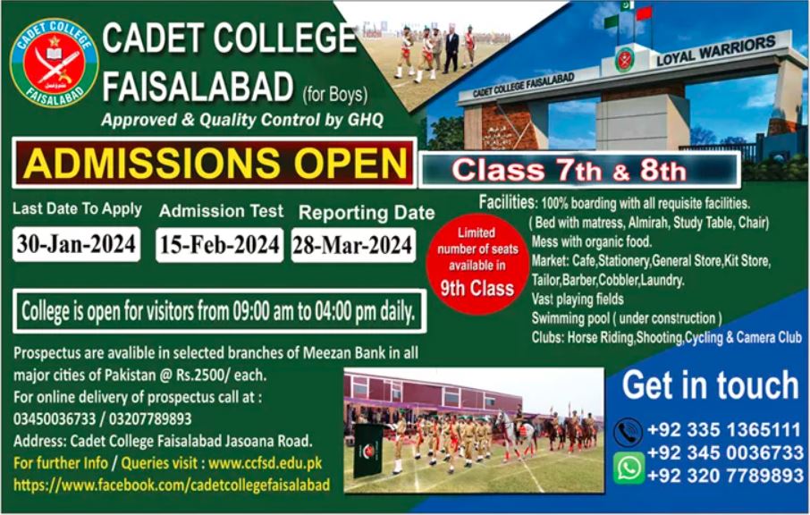Cadet College Faisalabad 7th & 8th Class Admissions 2024