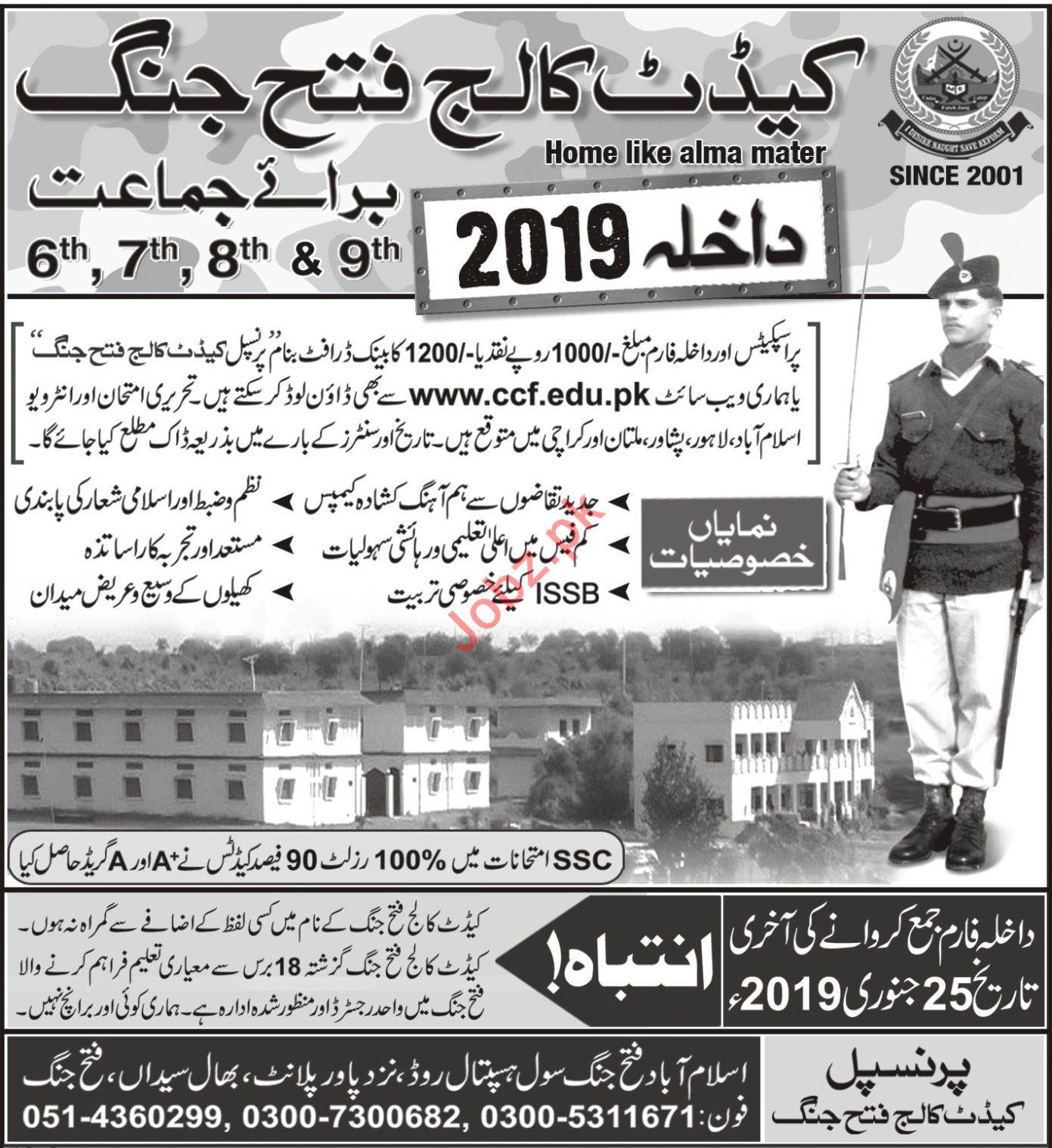 Cadet College Fateh Jang, Pakistan are announced admissions 2019 for the classes of Class 6, Class 7, Class 8 and Class 9. Last date of receipt of duly filled in application form is 25th January 2019 during office hours. Read newspaper ad for exact details.