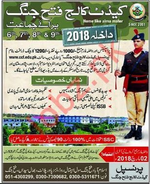 Cadet College Fateh Jang, Pakistan start admissions session 2018-2019 for the classes of 6th, 7th, 8th, 9th. Last date for submission of admission form is 02 March 2018. Read newspaper ad for exact details.