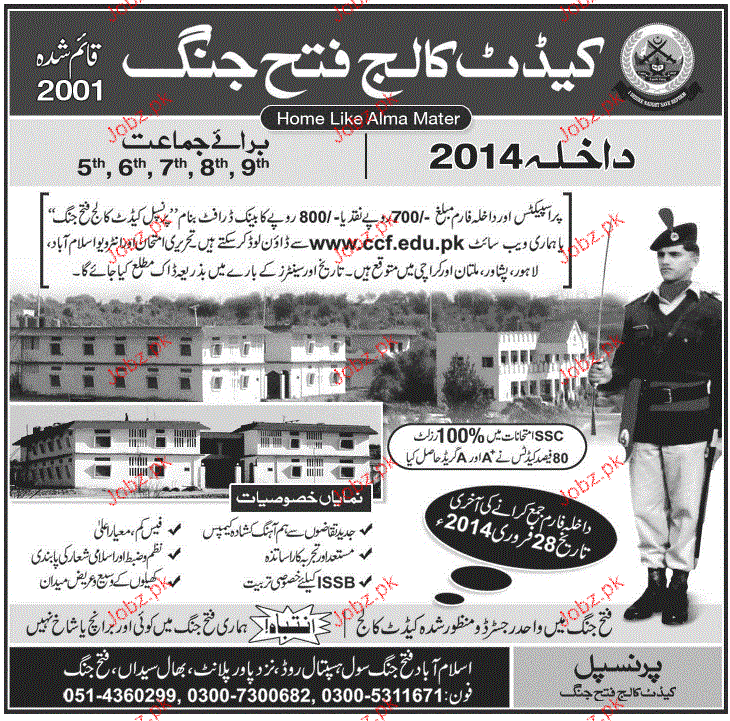 Cadet College Fateh Jhang Admission in Class V to IX in Fateh Jhang Read newspaper ad for exact details.