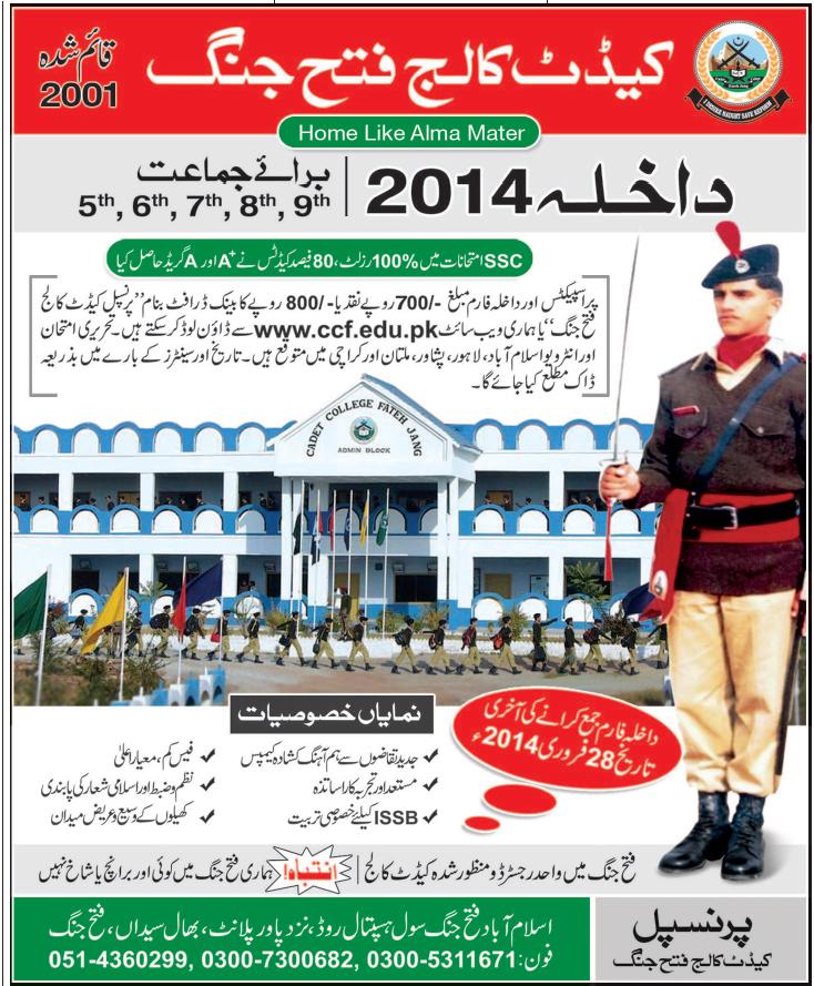 Cadet College Fateh Jhang Admission in Class V to IX in Fareh Jhang Read newspaper ad for exact details.