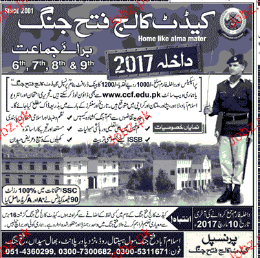 Cadet College Fateh Jhang Admission in Class VI to IX in Fateh Jhang. Read newspaper ad for exact details.