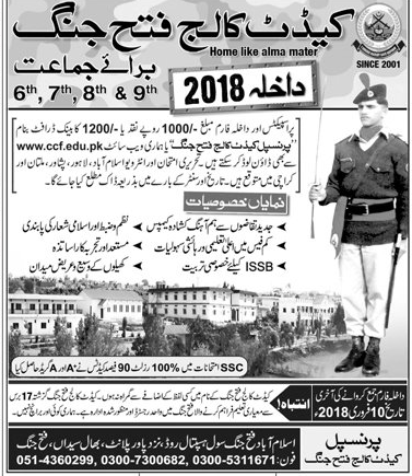 Cadet College Fateh Jhang Admission in Class VI, VII, VIII and IX in Fateh Jhang. Admission forms can be download from website of the college and last date is 10-02-2018. Read newspaper ad for exact details.