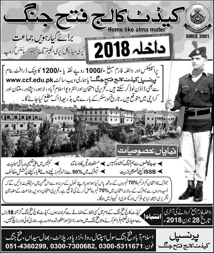 Cadet College Fateh Jhang Admission in Class XI Pre Medical, Pre Engineering and Computer Science Group in Fateh Jhang. Last date for submission of admission forms is 28 June 2018. Read newspaper ad for exact details.