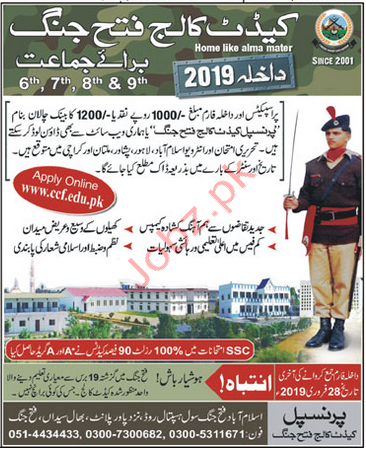 Cadet College Fateh Jhang has open Admissions for the Class of 6th, 7th, 8th, 9th, Matric in Fateh Jhang. Candidate may Download Challan Form Our Website , Written Test Will be held at Lahore, Islamabad Peshawar, Multan and Karachi. Read newspaper ad for exact details.