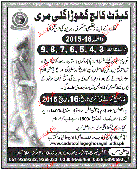 Cadet College Ghora Gali Admission in Class III to IX in Murree. Read newspaper ad for exact details.