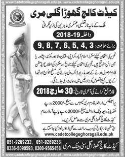 Cadet College Ghora Gali Murree Admission in Class III to Class IX in Murree. Last date for submission of admission forms is 30 March 2018. Admission Forms can also be download from College website. Read newspaper ad for exact details.