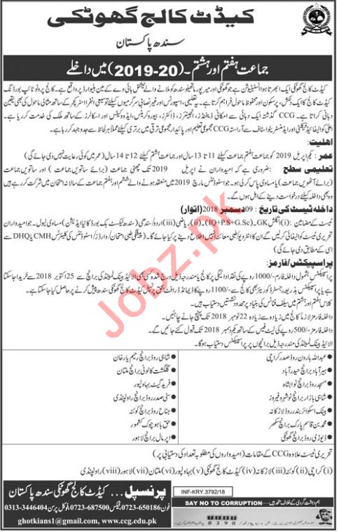 Cadet College Ghotki, Pakistan Army, Government of Pakistan are opened admissions for academic session 2018-2019 for the classes of VII and VIII. Last date of receipt of duly filled in application form is 22nd November 2018 during office hours. Read newspaper ad for exact details.