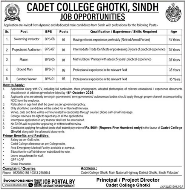 Cadet College invites applications for job positions advertised in daily Jang dated 24 September 2025 for following vacancies in Ghotki, ghotki Sindh Pakistan.
