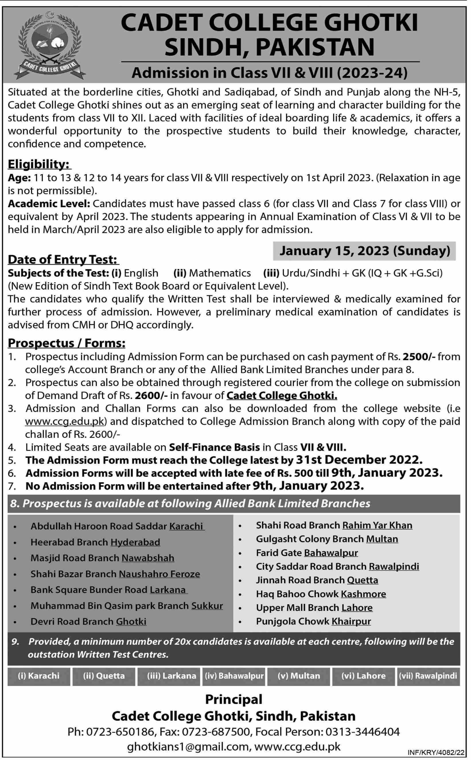 Cadet College Ghotki CCG admissions 2022 have been started. Eligible students can apply for academic admissions in 2022 in Cadet College Ghotki CCG Ghotki Sindh Pakistan for Computer University. Students for admission in Bachelor & criteria can apply as per Government institute admission policy 2022 before the closing date of November 10, 2022, as per the advertisement. Read newspaper ad for exact details.
