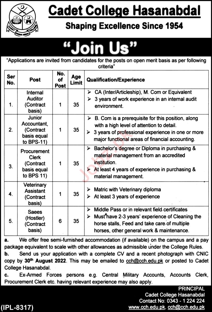 Cadet College Hassan Abdal, hassan abdal Punjab Pakistan invites applications from eligible candidates for the post of accountant, internal auditor, hostler, saees, procurement clerk and veterinary assistant as per advertisement of August 18, 2022 published in daily Nawaiwaqt Newspaper. Matric, B.com, Middle, CA, M.com and Bachelor etc. educational qualification will be preferred.
