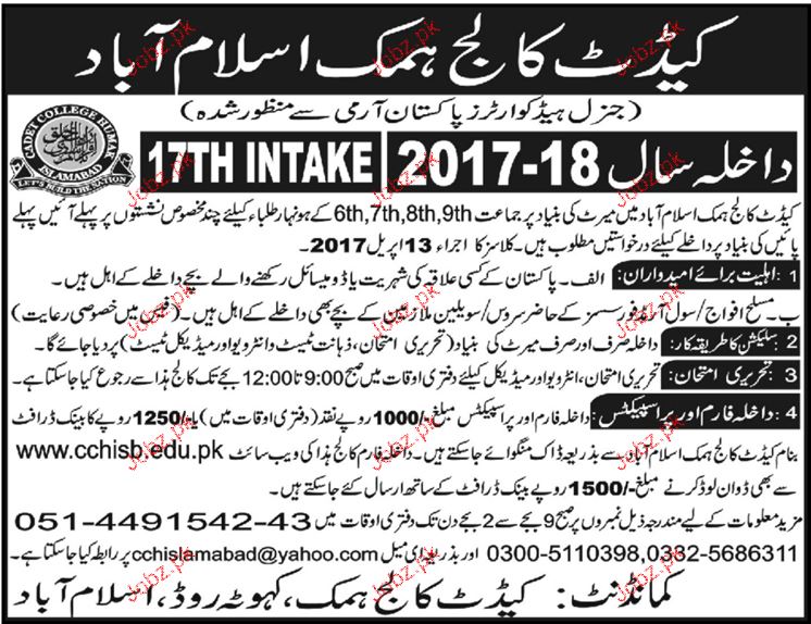 Cadet College Humak Admission in Class VI to IX in Islamabad. Read newspaper ad for exact details.