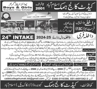 Admissions in Cadet College 2024 for Pre Engineering, Pre Medical, Computer Science has been announced. Students who want to take admissions in Cadet College Islamabad Islamabad Pakistan for academic year 2024 to continue education in Teaching Army can apply. Eligible students for fulfilling criteria for admissions in Intermediate can enroll as per Government admission policy 2024 till closing date 28 July 2024. Read newspaper ad for exact details.