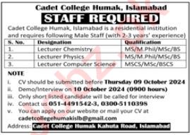 Cadet College jobs advertisement dated about 6 October 2024 in daily Jang Newspaper invites application for the vacant post of lecturer computer science, lecturer, lecturer chemistry and lecturer physics in Islamabad, islamabad Islamabad Pakistan. Preferred Education is M.sc, Mphil and MS etc.