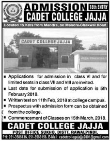 Cadet College Jajja, Rawalpindi start admission 2018 for the class of 6th. Last date for submission of admission forms is 05 February 2018. Commencement of Classes on 15th March 2018. Read newspaper ad for exact details.