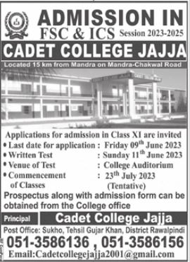 Admissions in Cadet College Jajja CCJ 2023 for Fsc, ICS has been announced. Students can enroll for admissions in Cadet College Jajja CCJ Gujar Khan Punjab Pakistan for academic year 2023 to continue campus based or online education in Science College. Students for admissions in ICS and Intermediate can apply for online or campus classes as per Private institute criteria till admission closing date June 6, 2023. Read newspaper ad for exact details.