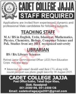 Cadet College Jajja CCJ Gujar Khan, gujar khan Punjab Pakistan invites applications from eligible candidates for the post of computer science teacher, teacher, english teacher, physics teahcer, pakistan studies teacher, islamiyat teacher, biology teacher, librarian, mathematics teacher, chemistry teahcer and urdu teacher as per advertisement of August 25, 2025 published in daily Jang Newspaper. Candidates with Bachelor and Master etc. educational background will be preferred.