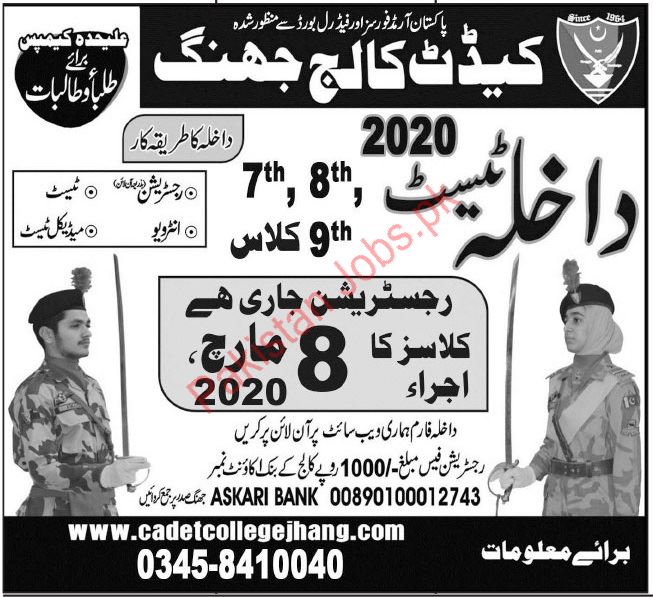 Cadet College Jhang Grade 7th to Grade 9th Admissions 2020