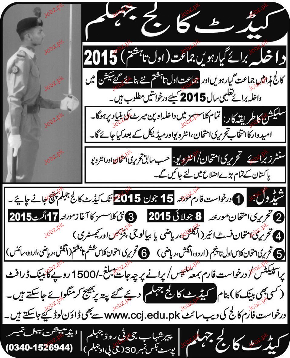 Cadet College Jhelum Admission in Class VIII in Jhelum. Read newspaper ad for exact details.