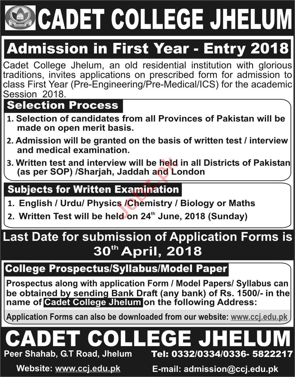 Cadet College Jhelum, Pakistan announced admission for sessions 2018 to 2019 for the classes of 1st Year (Pre Engineering, Pre Medical , ICS). Last date for submission of admission form is 30th April 2018. Read newspaper ad for exact details.
