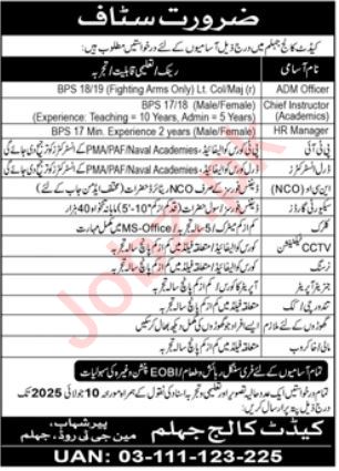 Cadet College Jhelum jobs advertisement dated about 22 June 2025 in daily Jang Newspaper invites application for the vacant post of Mali, Chief Instructor Academics, Cctv Technician, Khakrob, Clerk, Nursing, Hr Manager, Tandoorchi, Generator Operator, Cook, Adm Officer, Drill Instructor, Security Guard, Pti, Nco and Horse Servant in GT Road Jhelum, jhelum Punjab Pakistan. Preferred Education is Middle, Intermediate, Primary, Matric and Bachelor etc.