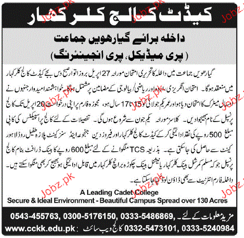 Cadet College Kallar Kahar Admission in Class XI in Kallar Kahar Read newspaper ad for exact details.