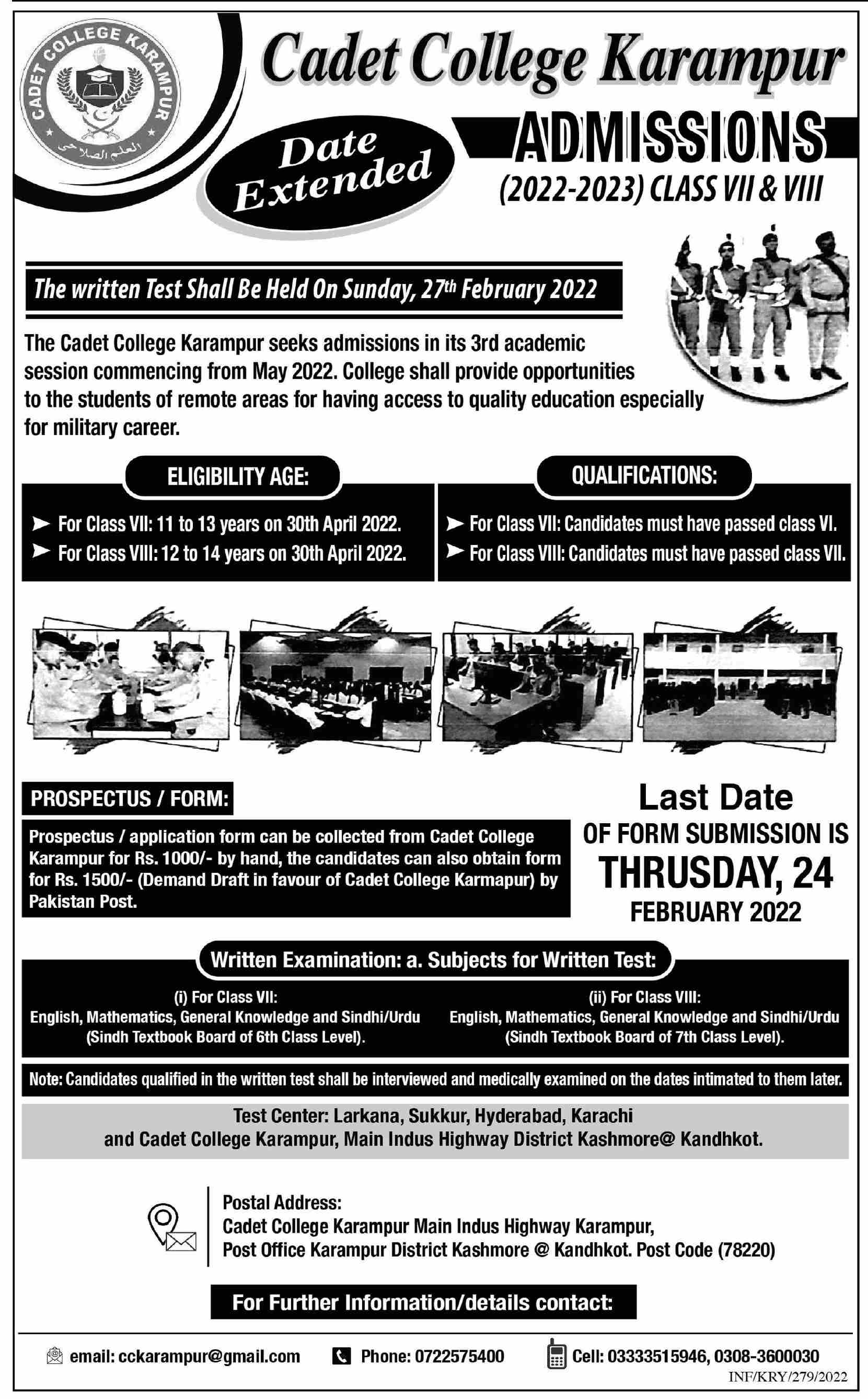 Cadet College Karampur 7th & 8th Class Admissions 2022 Date Extended