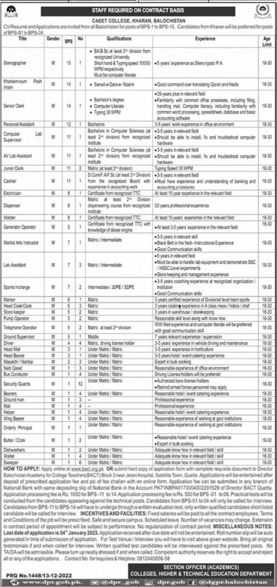 Cadet College is looking for candidates for following posts as per job advertisement published in daily Jang Newspaper of December 14, 2022 for location Kharan, kharan Balochistan Pakistan: