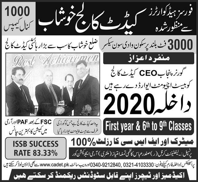 Pakistan Army Cadet College Khushab invited applications for admissions in Class 6th, Class 7th, Class 8th, Class 9th, Matric, Intermediate, FSc Pre Engineering and FSc Pre Medical. Read newspaper ad for exact details.