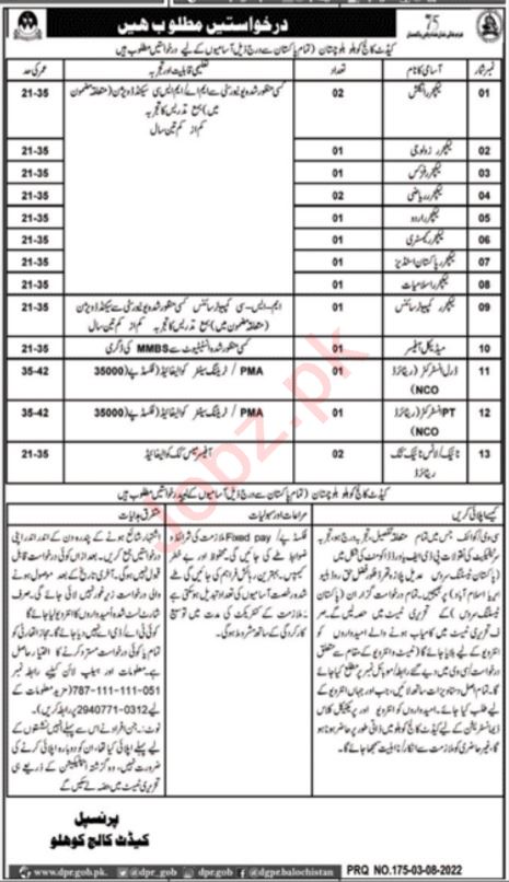 Cadet College Kohlu Jobs 2022