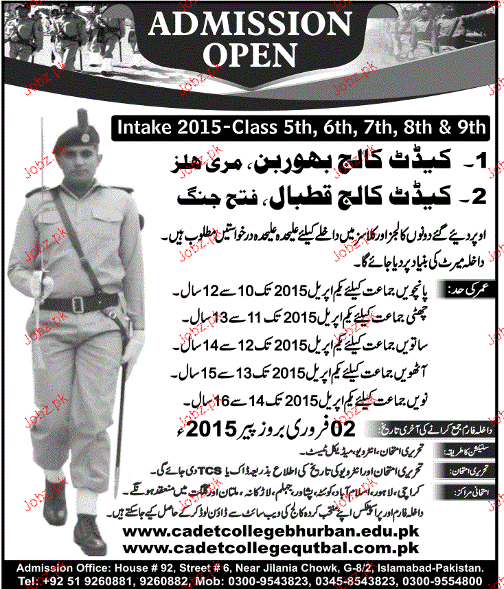 Cadet College Kutball Admission in Class VI to IX in Fateh jhang. Read newspaper ad for exact details.