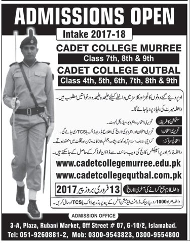 Cadet College Murree Admission in Class IV to IX in Murree. Read newspaper ad for exact details.