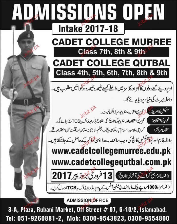 Cadet College Murree Admission in Class IV to IX in Muree. Read newspaper ad for exact details.