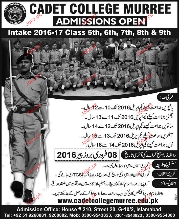 Cadet College Murree Admission in Class V to IX in Murree. Read newspaper ad for exact details.