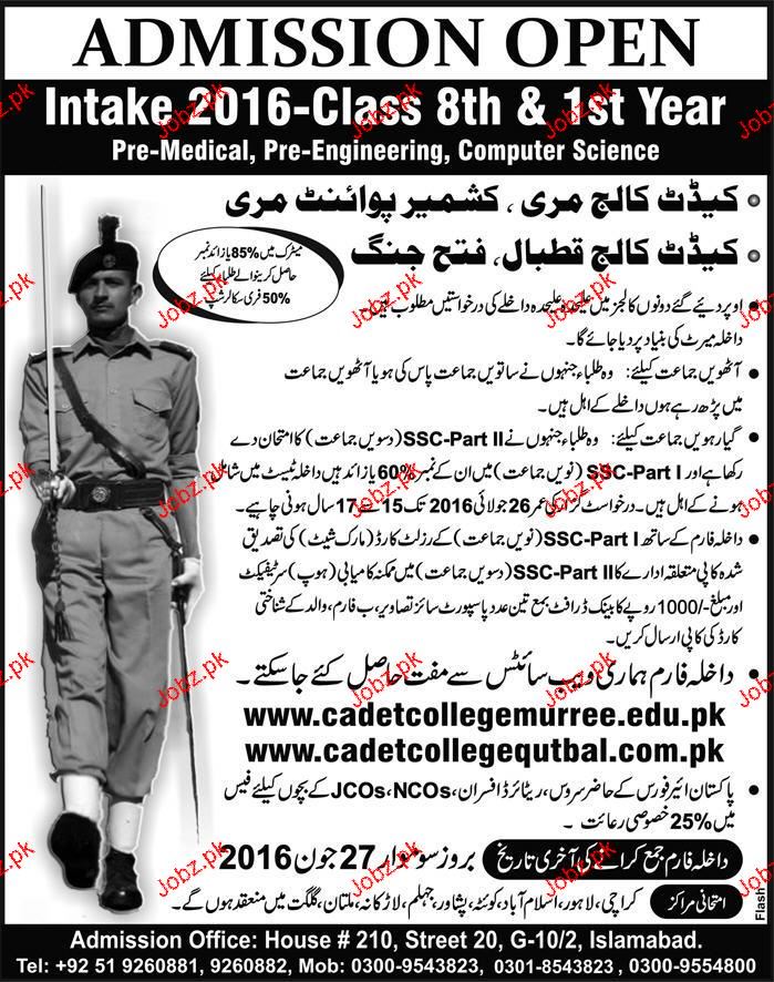 Cadet College Murree Admission in Class VIII to XI in Murree. Read newspaper ad for exact details.