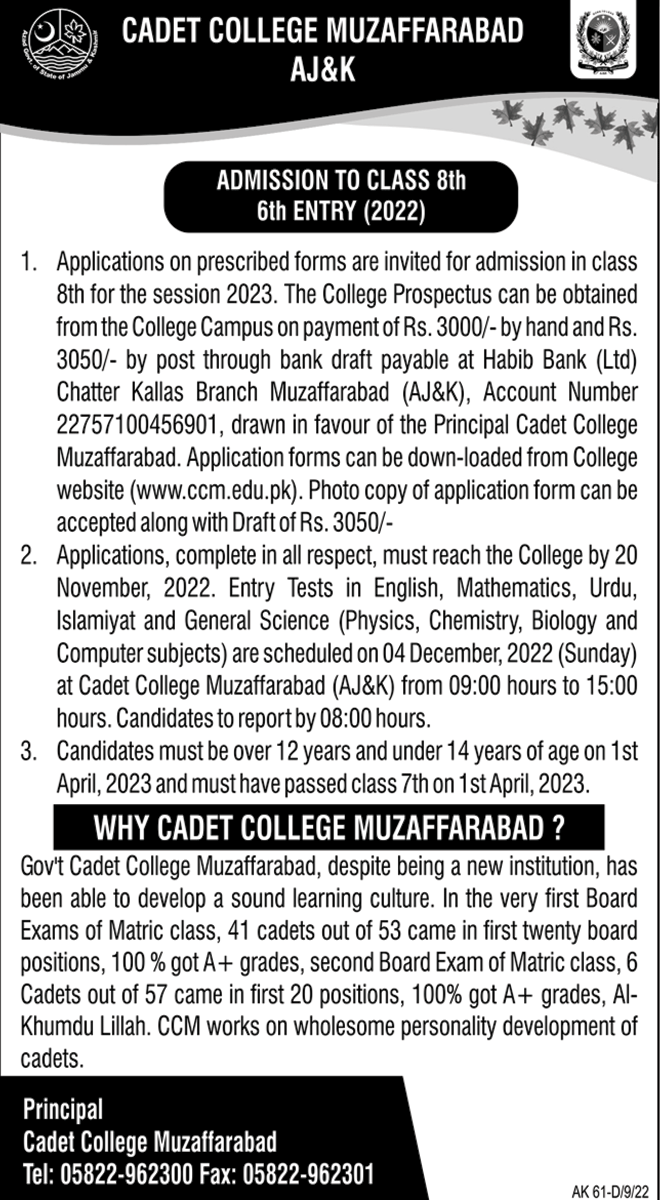 Cadet College Muzaffarabad CCM admissions 2022 for 8th class 6th class Admissions 2022. has been announced. Students who want to take admissions in Cadet College Muzaffarabad CCM Muzaffarabad AJK Pakistan for academic year 2022 to continue education in Teaching College can apply. Eligible students for fulfilling criteria for admissions in Middle can enroll as per Government admission policy 2022 till closing date 20 November 2022. Read newspaper ad for exact details.