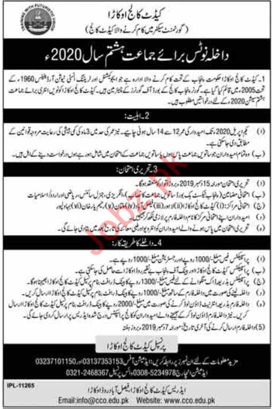Cadet College Okara, Pakistan Army, Pakistan are announcing admissions spring 2020 for the classes of Class 8th. Last date of receipt of duly filled in application form is 15th Dec 2019 during office hours. Read newspaper ad for exact details.