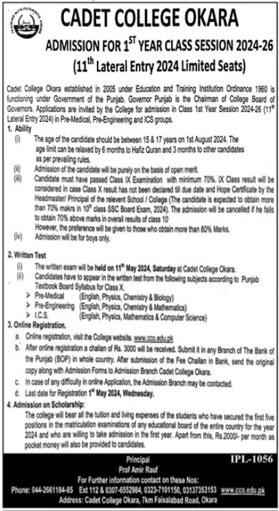 Cadet College Okara CCO has announced admissions 2024 for 1st Year, 11th Class, Fsc Pre Engineering, Fsc Pre Medical, ICom, ICS, FA General Scienc. Students can enroll for admissions in Cadet College Okara CCO Okara Punjab Pakistan for academic year 2024 to continue campus based or online education in Science College. Students who want to enroll for academic session 2024 in Intermediate qualification and admission criteria for Government institute can apply till last date 1 May 2024. Read newspaper ad for exact details.