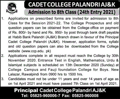 Pakistan Army Cadet College invites applications for admissions in Class 8th in Palandri Azad Jammu & Kashmir AJK. The College Prospectus and old question papers can be obtained from the College Office. Read newspaper ad for exact details.