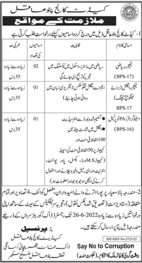 Cadet College Pano Aqil jobs advertisement dated about 12 June 2022 in daily Jang Newspaper invites application for the vacant post of mathematics lecturer, pa, lecturer, english lecturer, stenographer, personal assistant and language lecturer in Sukkur, sukkur Sindh Pakistan. Candidates with MA, Intermediate and Master etc. educational background will be preferred.