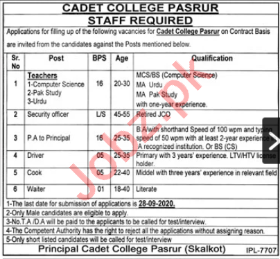 Cadet College Pasrur, Pakistan Army, Government of Pakistan is seeking candidates for the posts of Teacher, Computer Science Teacher, Pakistan Study Teacher, Urdu Teacher, Security Officer, PA, Personal Assistant, Driver, LTV Driver, HTV Driver, Cook, Chef, Waiter.