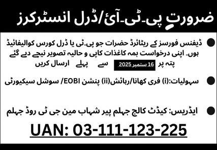 Cadet College Jhelum GT Road Jhelum, jhelum Punjab Pakistan invites applications from eligible candidates for the post of pt instructor and drill instructor as per advertisement of September 8, 2025 published in daily Express Newspaper. Educational qualifications required Intermediate and Bachelor etc.