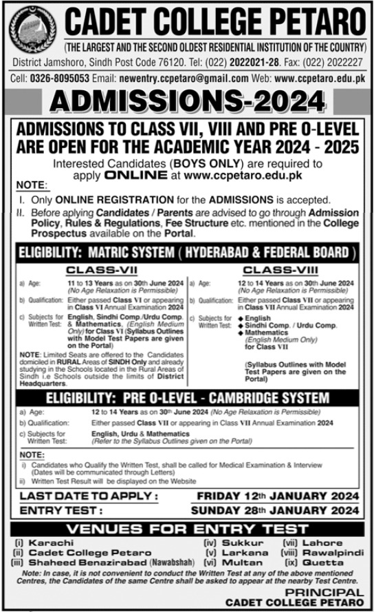 Cadet College Petaro Class 7th 8th & Pre OLevel Admissions 2024