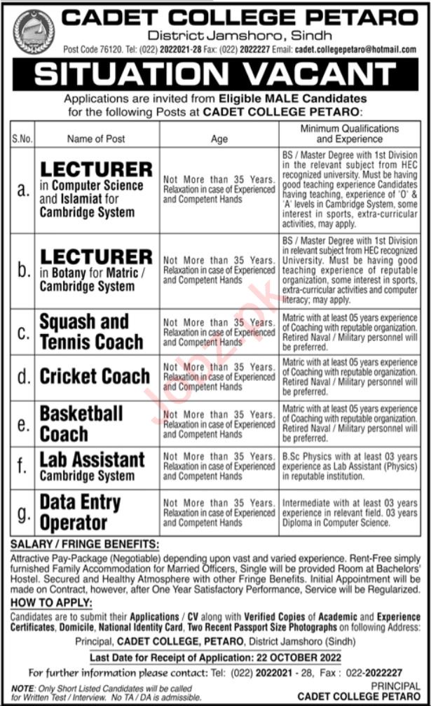 Vacant posts including lecture botany, data entry oeprator, cricket coach, basket ball coach, lab assistant, squash coach, lecturer computer science and lecturer islamiat are announced in Cadet College Petaro Jamshoro, jamshoro Sindh Pakistan as per 9 October 2022 advertisement in daily Jang Newspaper. Persons with Bachelor, Master, Mphil and MS etc. education can apply.