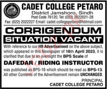 Cadet College Petaro is looking for candidates for following posts as per job advertisement published in daily Kawish Newspaper of May 1, 2023 for location Jamshoro, jamshoro Sindh Pakistan: