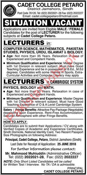 Latest Cadet College Teaching Posts Jamshoro 2025